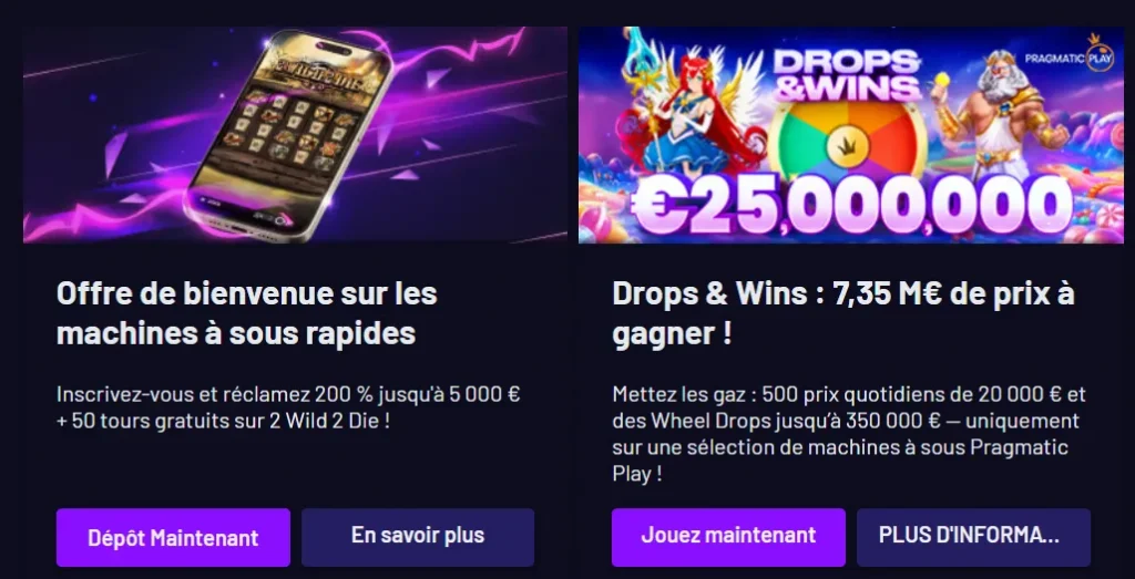 - Offres spéciales liées à des campagnes comme Drops & Wins qui distribuent des prix instantanés